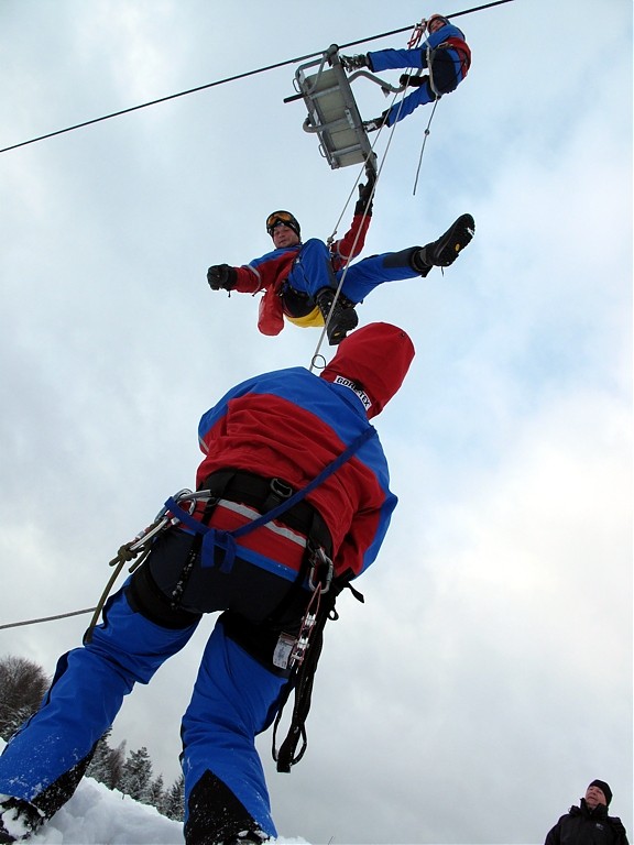 Kamera towarzyszyła ratownikom podczas ćwiczeń ewakuacji z kolejki linowej w Ustrzykach Dolnych, podczas patrolu w Ustrzykach Górnych oraz na Połoninie Wetlińskiej. Na zdjęciach: Stacja GOPR w Ustrzykach Górnych, ewakuacja z kolei Laworta, Połonina Wetlińska.